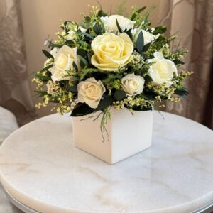 Благодаря стабилизации, цветы сохраняют свежесть и привлекательность на месяцы, не требуя специального ухода. Светло-жёлтые розы в белой вазе-кубе выглядят эффектно и элегантно, украшая интерьер гостиницы, ресепшн или домашнее пространство.
