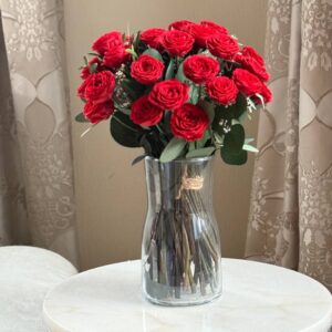 Создайте атмосферу праздника и романтики с букетом из кустовых алых роз с эвкалиптом. Алхимия ярких стабилизированных цветов и свежей зелени воплощена в элегантной стеклянной вазе, даря интерьеру живую энергию и элегантность.