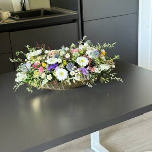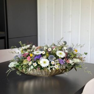 Приходите в страну солнца и полей с композицией из стабилизированных летних цветов в ладье с золотистой патиной. Яркие, разнообразные полевые цветы, будто сорванные ранним утром, собираются в веселую симфонию цвета и запаха.