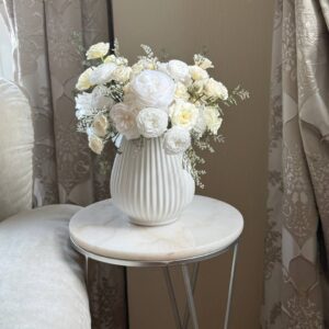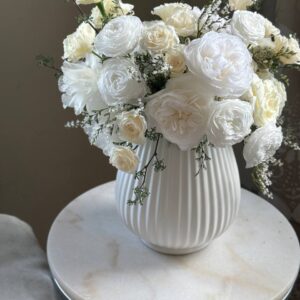 Окунитесь в мир белоснежного изящества с композицией из стабилизированных белых роз. Ювелирно уложенные в элегантную керамическую вазу с вертикальными ребрами, цветы излучают гармонию и спокойствие.