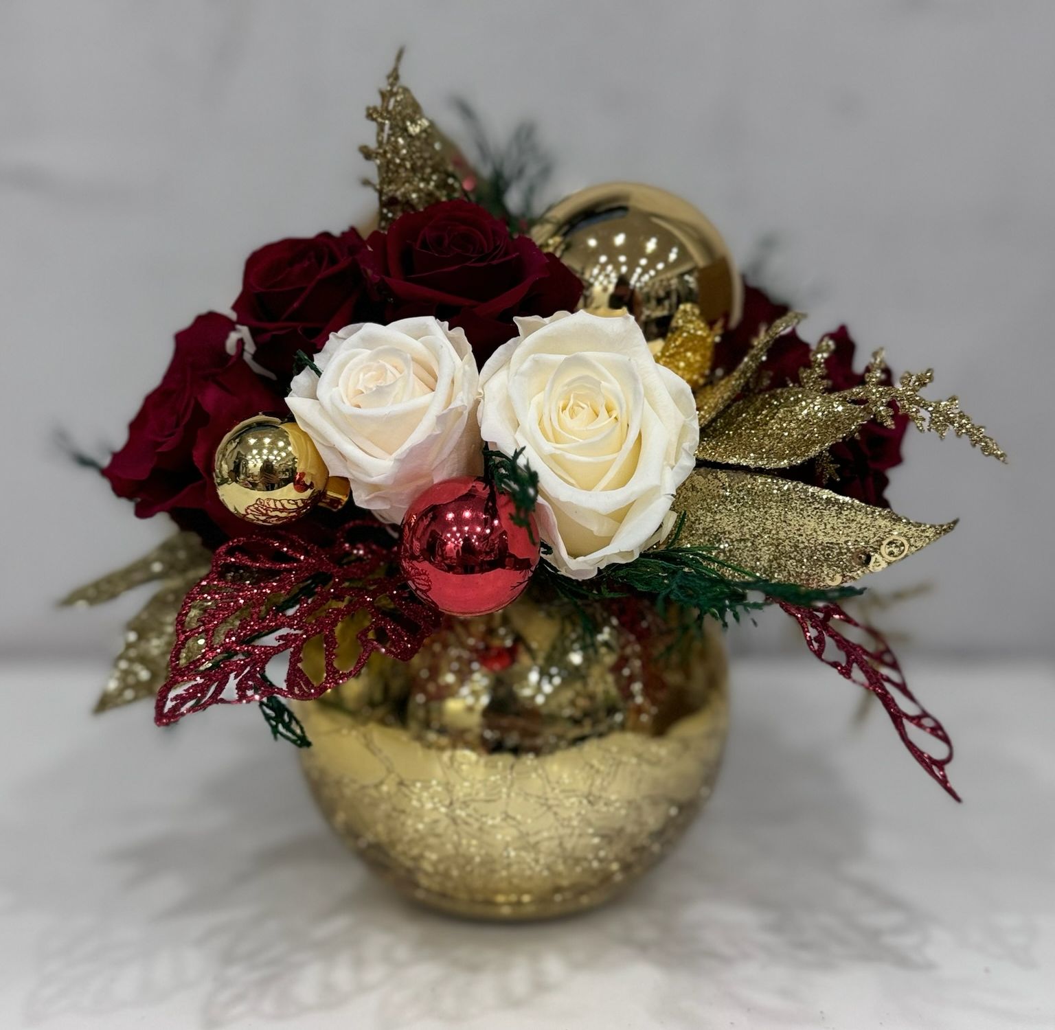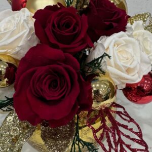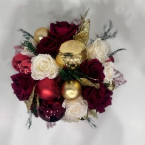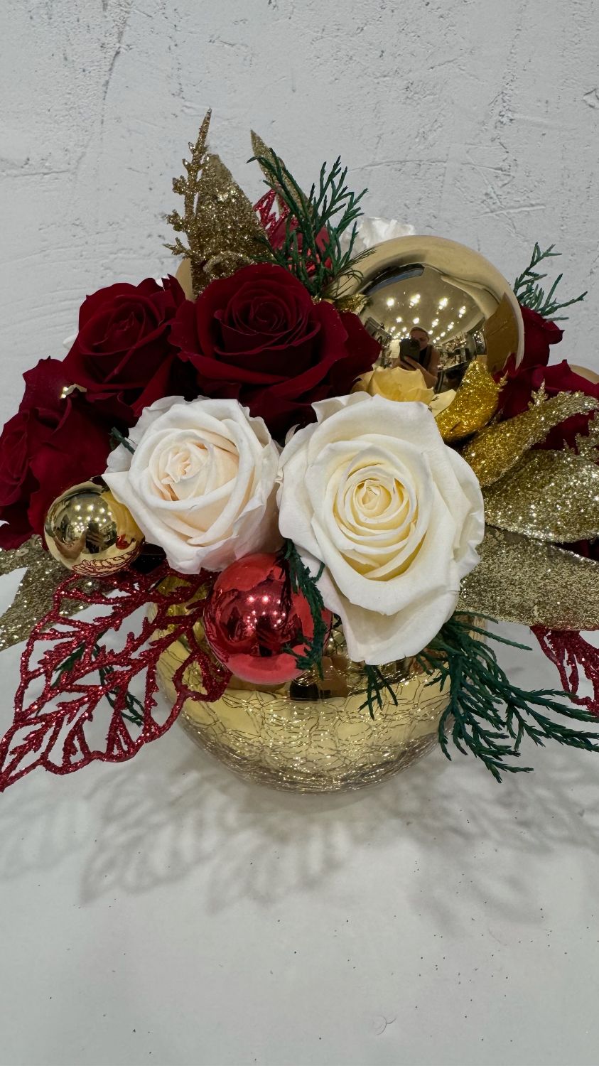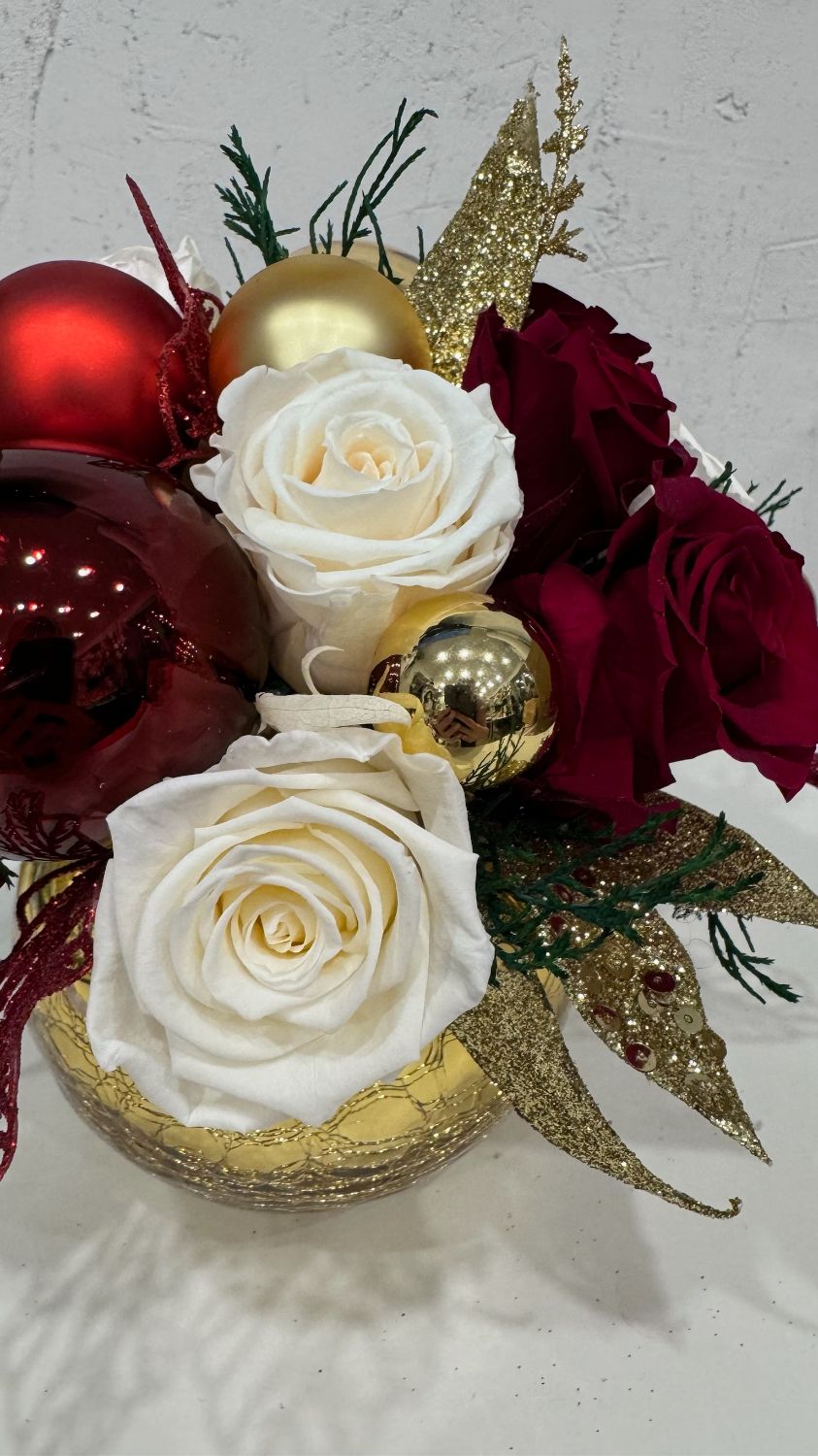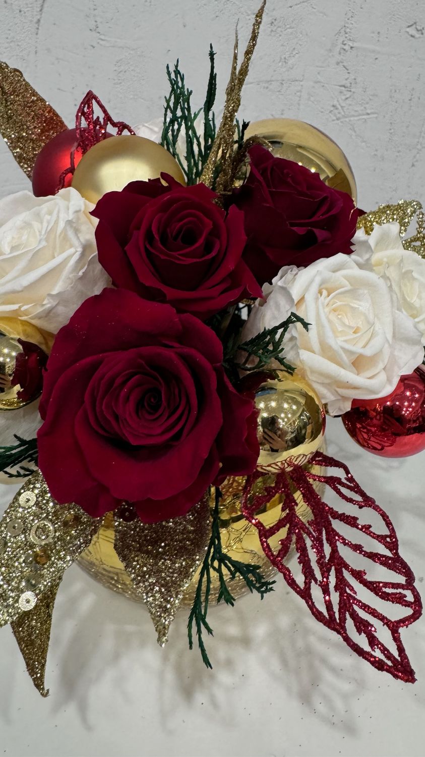 Рождественская интерьерная композиция «Рождественская симфония» от Tamara Leman — это настоящее произведение искусства, которое создаст атмосферу уюта и волшебства в вашем доме. Композиция выполнена из стабилизированных роз темно-красного и белого цвета, украшенных новогодними шарами красного и золотого цвета. Искусственные листья темно-красного и золотого цвета добавляют композиции изысканности и блеска. Вся композиция размещена в круглой вазе золотого цвета, которая подчеркивает элегантность и торжественность.