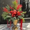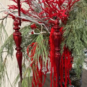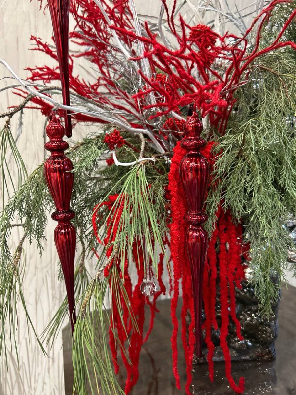 - Уникальный дизайн: Комбинация зеленых веточек, красного амаранта и красных сосулек создает неповторимую атмосферу.