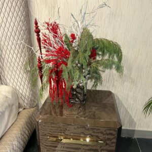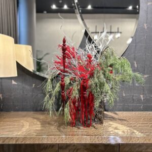 Рождественская интерьерная композиция «Рождественский лес» от студии флористики и декора Tamara Leman — это настоящее произведение искусства, которое создаст атмосферу уюта и волшебства в вашем доме. Композиция выполнена из зеленых сосновых ветвей, украшенных красным амарантом, который свисает, добавляя композиции изысканности и блеска. Красные длинные сосульки и натуральные ветки, покрытые красным и белым цветом, создают ощущение свежести и чистоты. Вся композиция размещена в высокой квадратной вазе, визуально поверхность которой выглядит как необработанный камень, что придает ей элегантный и изысканный вид.