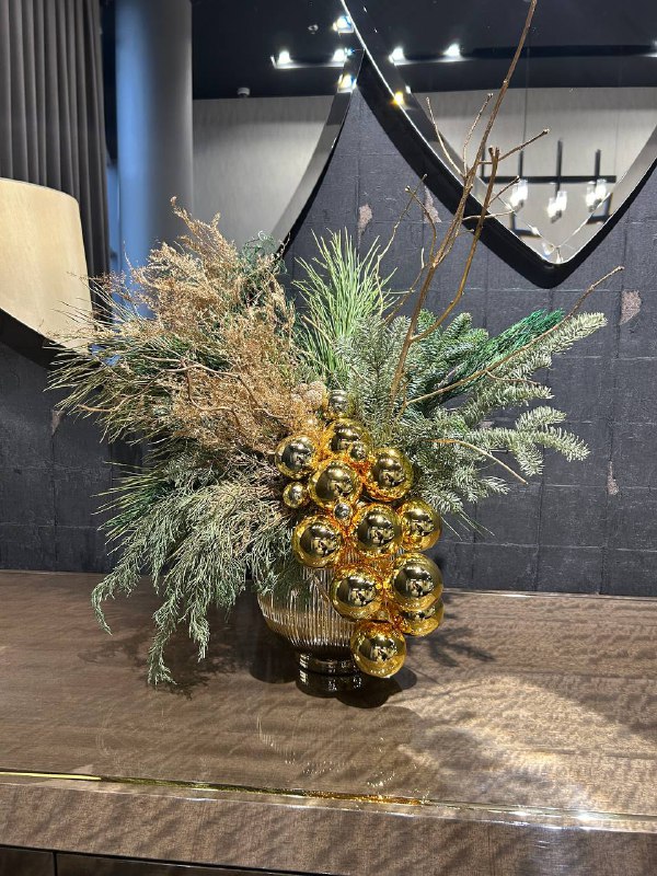 - Уникальный дизайн: Комбинация зеленых веточек и золотых шаров создает неповторимую атмосферу.