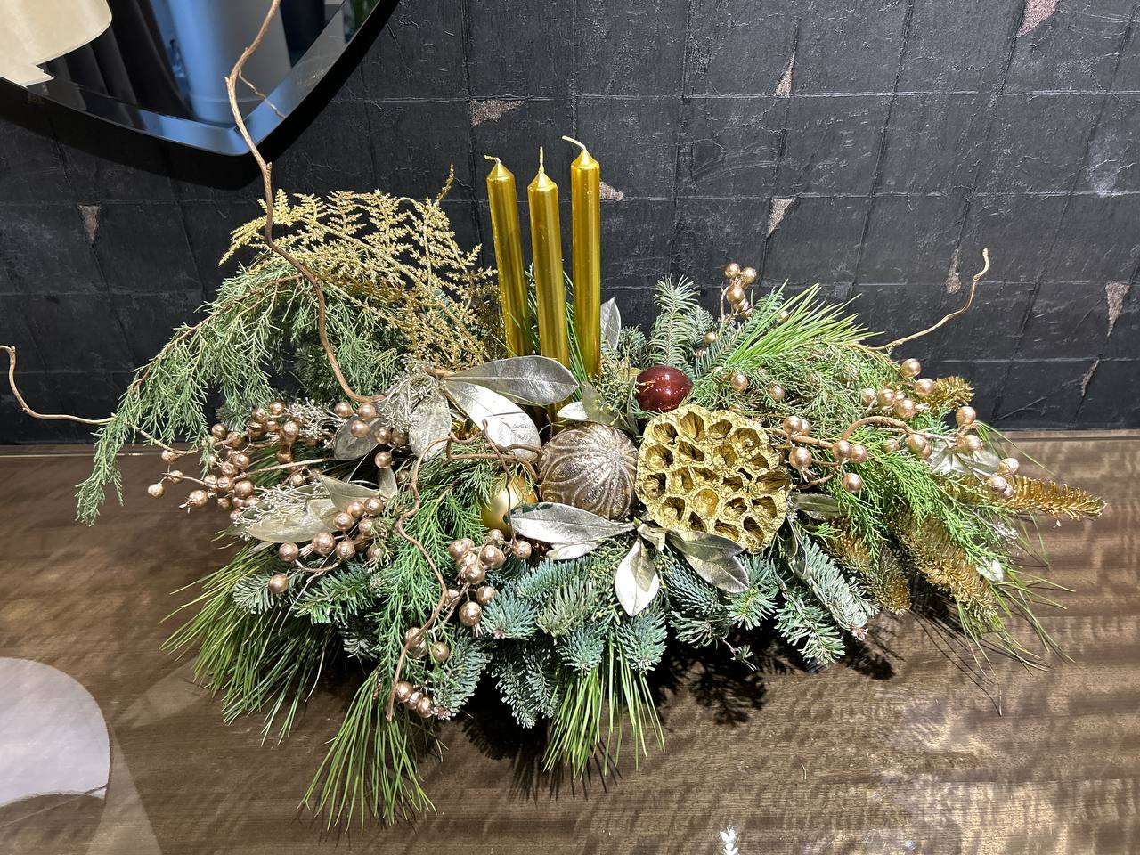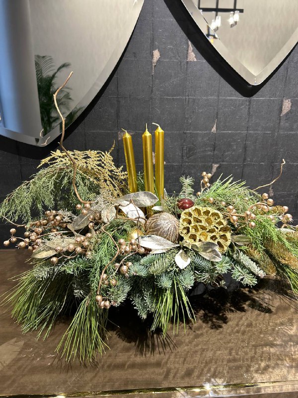 - Уникальный дизайн: Комбинация зеленых веточек, золотых шаров и свечей создает неповторимую атмосферу.
