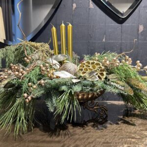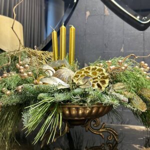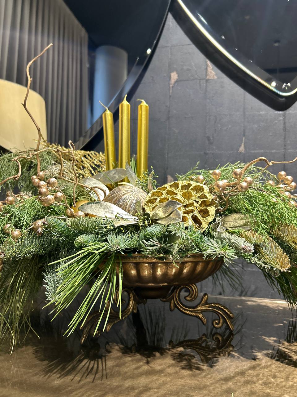 Рождественская интерьерная композиция «Зимняя симфония» от студии флористики и декора Tamara Leman — это настоящее произведение искусства, которое создаст атмосферу уюта и волшебства в вашем доме. Композиция выполнена из длинных зеленых сосновых ветвей и веточек ели, которые создают ощущение дремучего леса. В центре композиции расположены несколько золотых шаров, а также ветки с шариками, покрытыми бронзовым цветом, что добавляет ей изысканности и блеска. Три золотых длинных свечи в центре композиции создают атмосферу уюта и тепла. Вся композиция размещена в вазоне-блюде на ножках с завитками, что придает ей элегантный и изысканный вид.