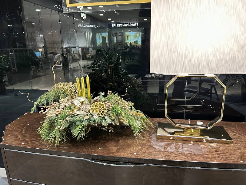 - Элегантность: Золотые элементы и зеленые ветки придают композиции изысканный вид.