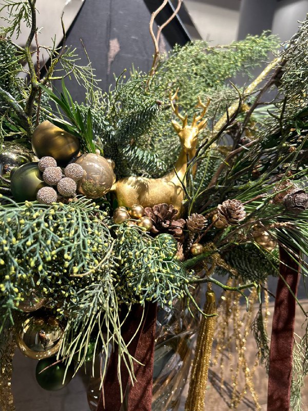 - Элегантность: Золотые элементы и зеленые ветки придают композиции изысканный вид.