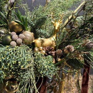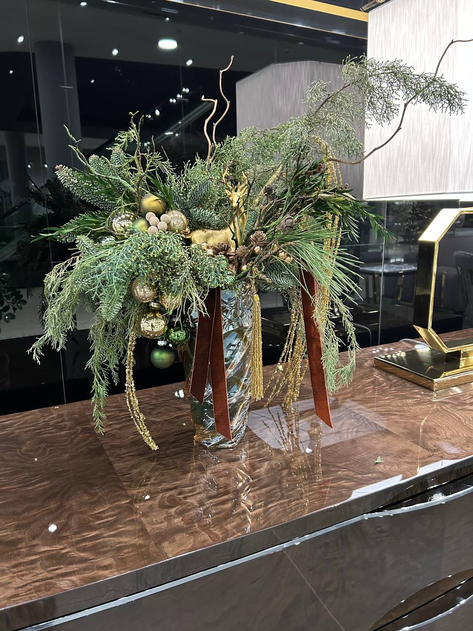 Рождественская интерьерная композиция «Лесная сказка» от студии флористики и декора Tamara Leman — это настоящее произведение искусства, которое создаст атмосферу уюта и волшебства в вашем доме. Композиция выполнена из длинных зеленых сосновых ветвей и веточек ели, которые создают ощущение дремучего леса. Ветви разной высоты торчат в разные стороны, добавляя композиции динамики и объема. На ветках висят шары золотого и зеленого цвета, а также шишки, что придает ей изысканности и блеска. В композиции есть длинные ветки деревьев, которые как коряги торчат в стороны, создавая эффект природного хаоса. В центре композиции расположен золотой олень, а коричневые ленты свисают вниз, добавляя композиции изысканности и блеска. Вся композиция размещена в высокой прозрачной стеклянной вазе с грубой текстурой, что придает ей элегантный и изысканный вид.