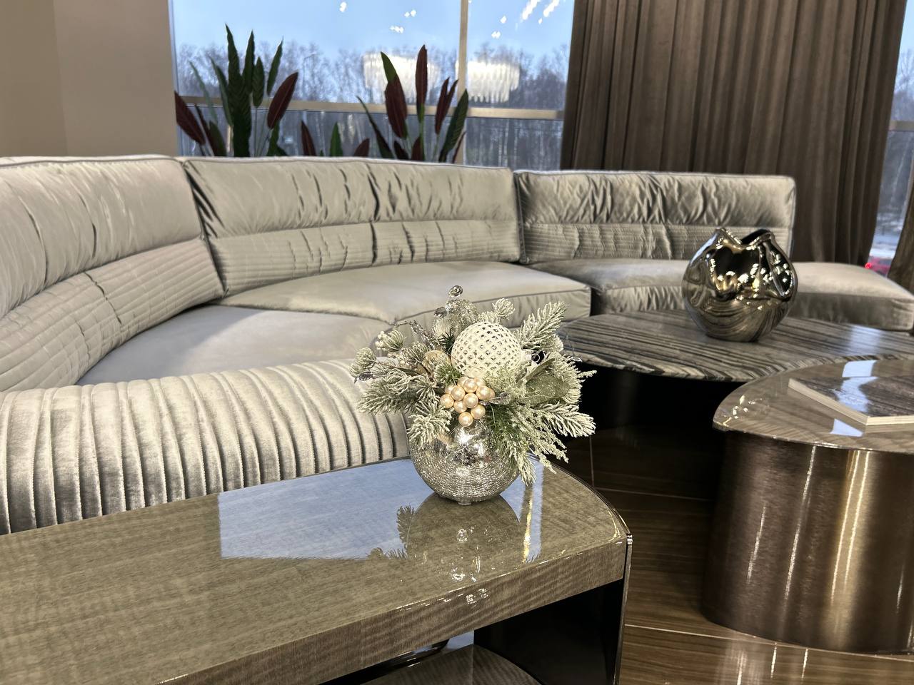 Рождественская интерьерная композиция «Снежное чудо» от студии флористики и декора Tamara Leman — это настоящее произведение искусства, которое создаст атмосферу уюта и волшебства в вашем доме. Композиция выполнена в круглой серебристой вазе, где еловые веточки асимметрично размещены и покрыты белым заснеженным покрытием, создавая ощущение зимнего леса. В центре композиции расположен большой рельефный белый шар, который добавляет ей изысканности и блеска. Небольшие серебристые и белые шары разбросаны по композиции, создавая ощущение легкости и воздушности.