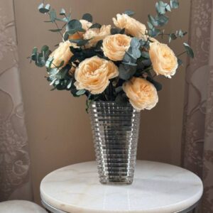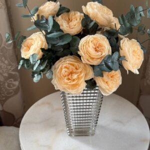 Теги: букет в вазе, персиковые розы, прозрачная ваза, стабилизированные цветы