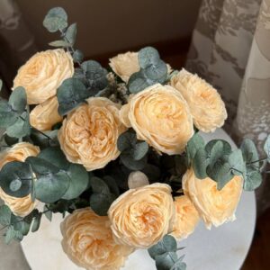 Букет из стабилизированных роз от студии Tamara Leman создан как вечный акцент для интерьера. Нежные персиковые «вечные розы» в обрамлении стабилизированного эвкалипта выглядят свежими, будто только что срезаны, но при этом годами не вянут и не требуют ухода. Такая композиция из стабилизированных цветов станет стильным декором для дома или офиса, идеальным подарком, который долго напоминает о важном событии.