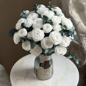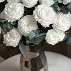 Белоснежный букет из стабилизированных кустовых роз от студии Tamara Leman создан для тех, кто любит идеальный порядок в деталях. Нежные стабилизированные розы с тонкими лепестками образуют плотное облако и оттеняются благородным эвкалиптом, подчёркивая чистоту и свежесть композиции.