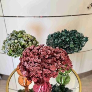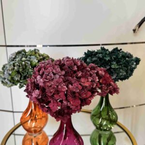 Мини композиции из стабилизированной гортензий разного цвета в элегантных вазочках с узким горлышком из цветного стекла. Это истинное произведение искусства, способное преобразить любое пространство. Яркие акценты в интерьере. Цветные вазы придают композиции дополнительную элегантность и интерес, создавая эффект яркого элемента. Стабилизированные гортензии, обладающие яркими и насыщенными цветами, наполняют атмосферу нежностью и утонченностью, а их долговечность позволяет наслаждаться красотой букета долгое время без необходимости ухода.