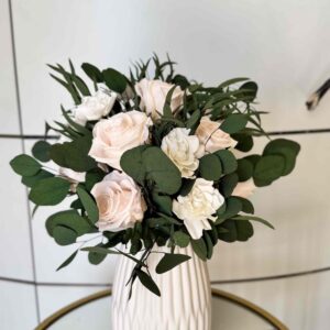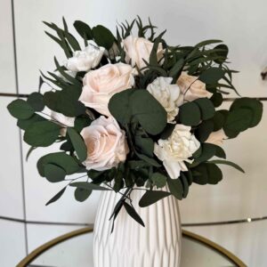Теги: белая ваза, белые розы, гардения, стабилизированные цветы, эвкалипт