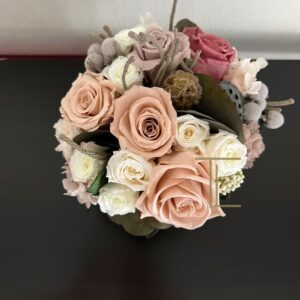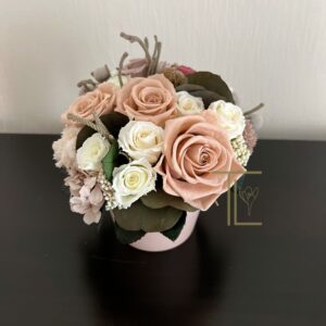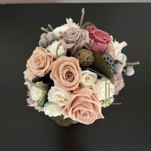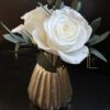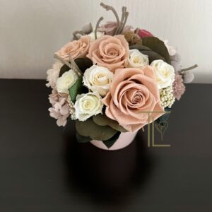 Небольшой аккуратный нежный букетик из роз белого, кремового и бежевого оттенков. Ваза в виде расширяющегося к верху ведерка в тон с бутонами создает гармоничную композицию. Такой букетик можно поставит на прикроватную тумбу, на столик в ресторане или на ресепшн в гостинице. Зеленые веточки оживляют цветы. Стабилизированные цветы изготавливаются по особой технологии, которая позволяет растениям оставаться свежими и не вянуть в течение нескольких лет. Получается значительная экономия на тратах на декор помещений.
