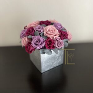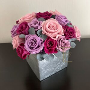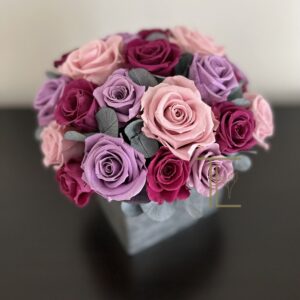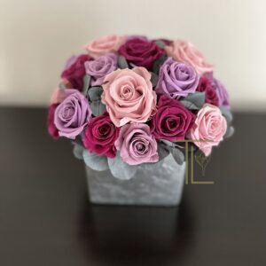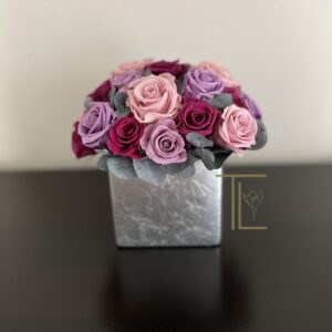Букет состоит из 25 роз разного цвета — от нежного бежевого, до яркого сиреневого. Бутоны перемежаются зелеными листьями эвкалипта. Нежные цветы в виде полусферы располагаются  в вазе из серого гранита. Именно такое сочетание придает композиции неповторимость и шарм. Такой букет будет отлично смотреться в гостиничном номере или на офисном ресепшн. Стабилизированные цветы абсолютно неприхотливы. Они не требуют абсолютно никакого ухода и остаются презентабельными в течение нескольких лет.