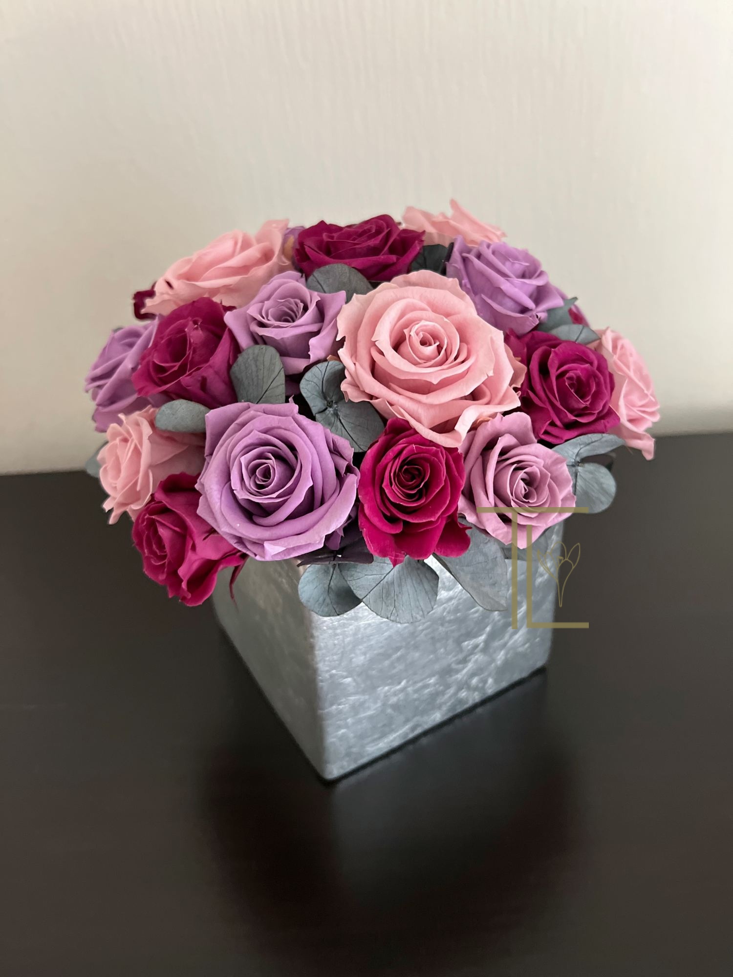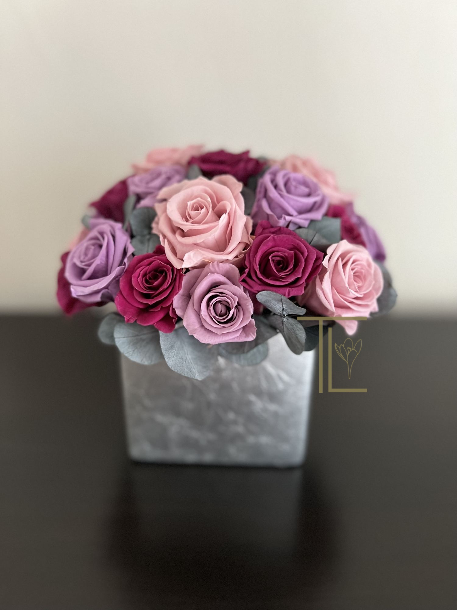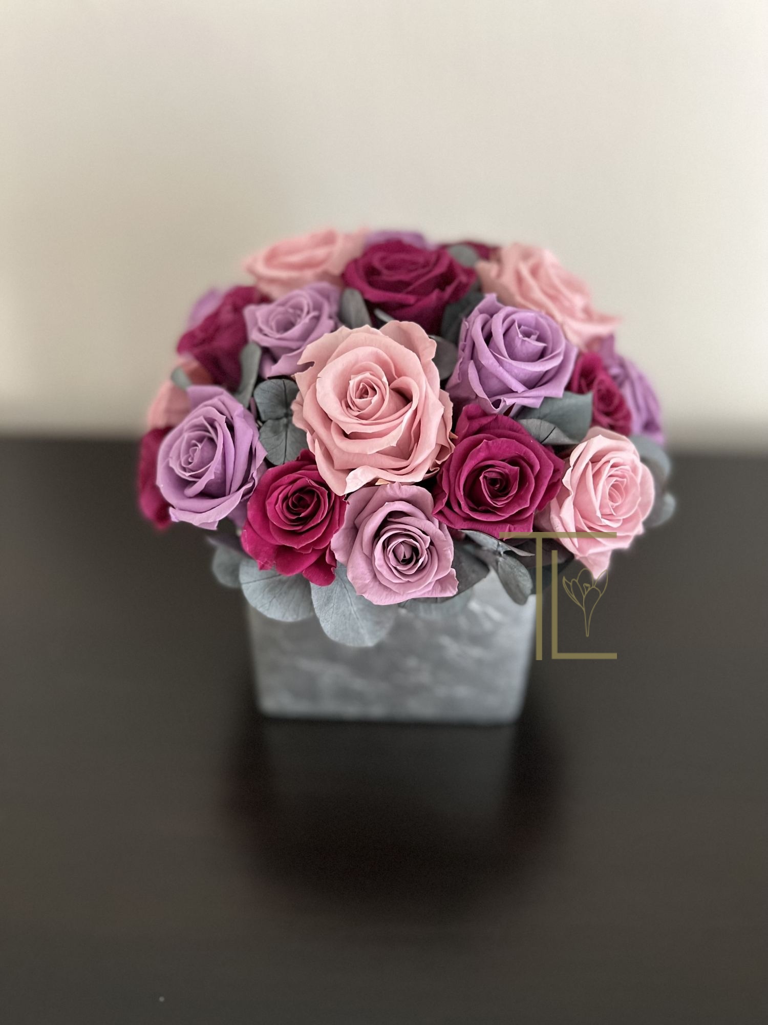 Букет состоит из 25 роз разного цвета — от нежного бежевого, до яркого сиреневого. Бутоны перемежаются зелеными листьями эвкалипта. Нежные цветы в виде полусферы располагаются  в вазе из серого гранита. Именно такое сочетание придает композиции неповторимость и шарм. Такой букет будет отлично смотреться в гостиничном номере или на офисном ресепшн. Стабилизированные цветы абсолютно неприхотливы. Они не требуют абсолютно никакого ухода и остаются презентабельными в течение нескольких лет.
