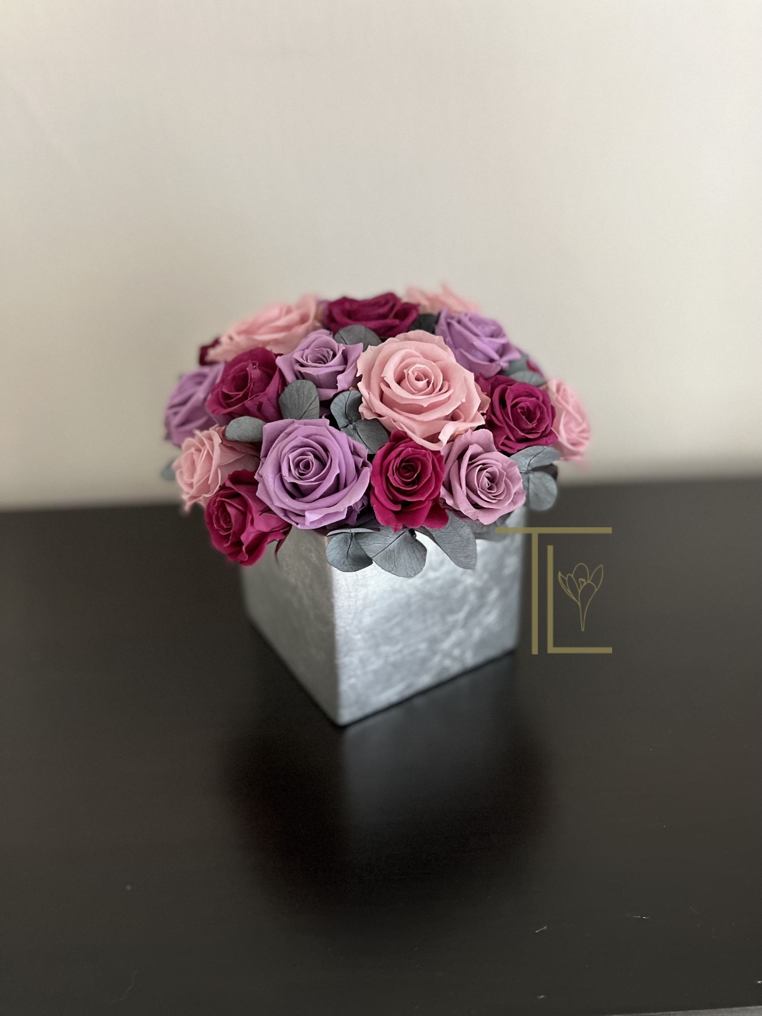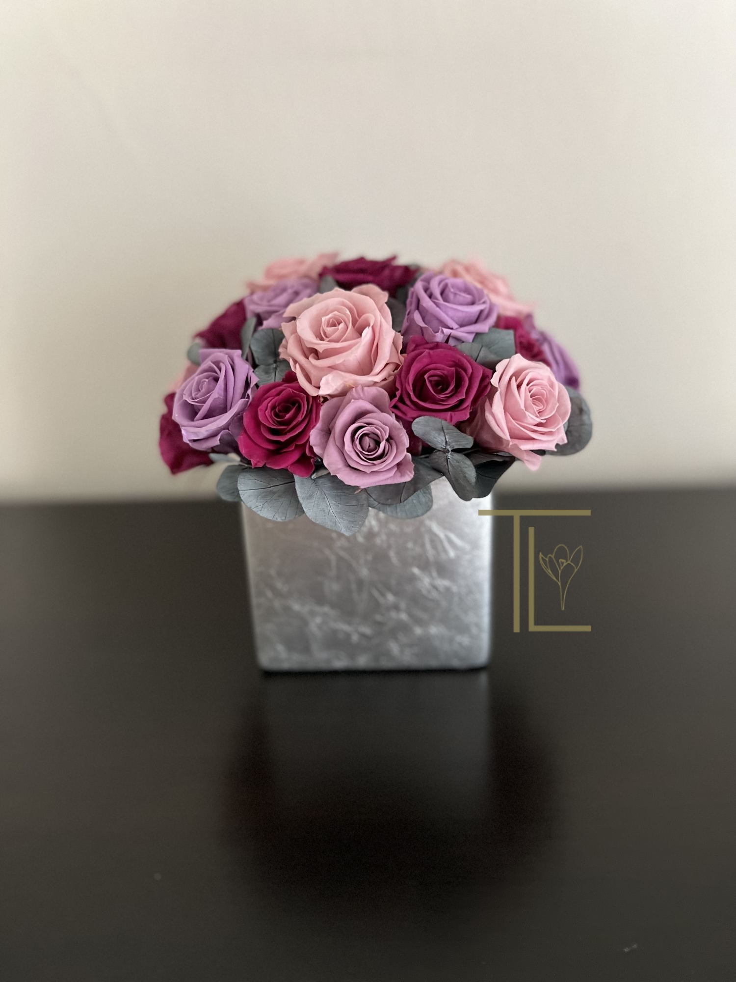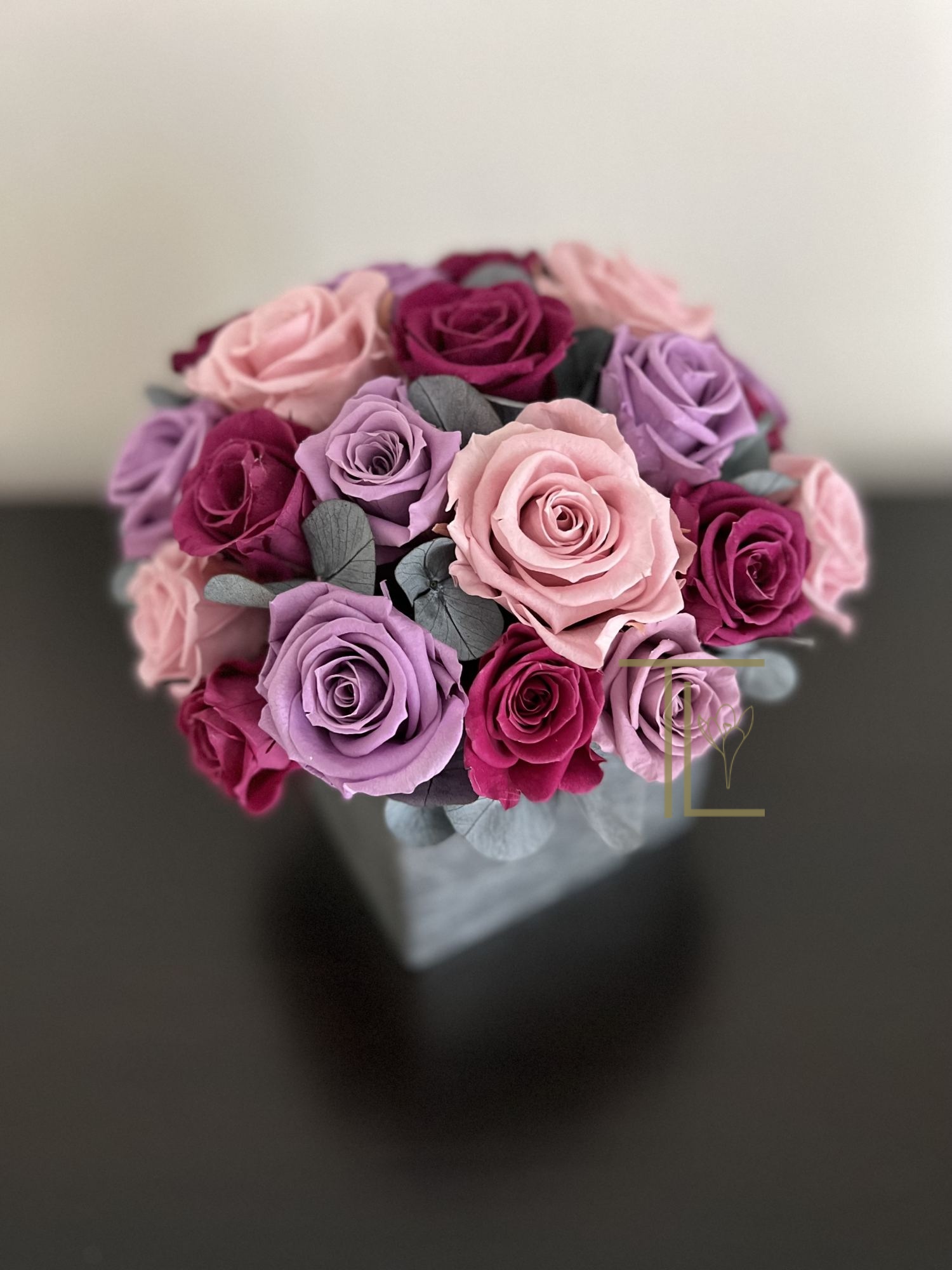 Букет состоит из 25 роз разного цвета — от нежного бежевого, до яркого сиреневого. Бутоны перемежаются зелеными листьями эвкалипта. Нежные цветы в виде полусферы располагаются  в вазе из серого гранита. Именно такое сочетание придает композиции неповторимость и шарм. Такой букет будет отлично смотреться в гостиничном номере или на офисном ресепшн. Стабилизированные цветы абсолютно неприхотливы. Они не требуют абсолютно никакого ухода и остаются презентабельными в течение нескольких лет.
