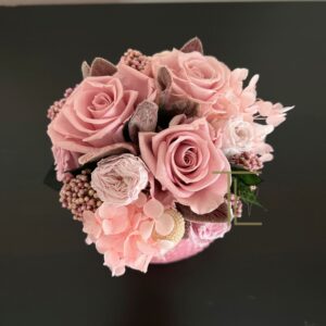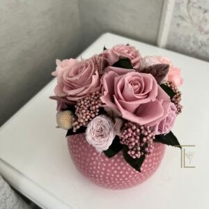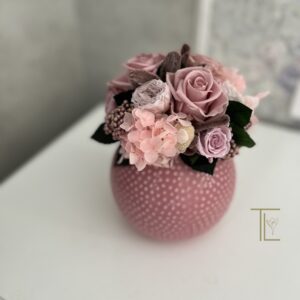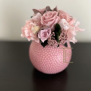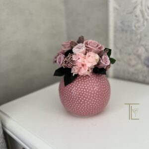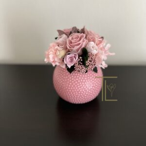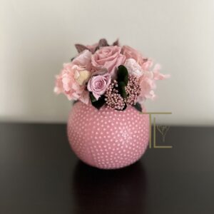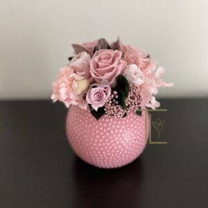 Очаровательный розовый букетик для гостиничного холла, ресепшн или прикроватной тумбы. Композиция позволит создать уют и теплую душевную атмосферу. Стабилизированные цветы не требуют ухода, не завянут в течение нескольких лет и будут украшать помещение с любым стилем в интерьере. Розовые розы и нежные гортензии в вазе сферической формы в нежном розовом цвете. На вазе выполнен орнамент в виде выступающих бусинок.