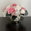 Очаровательный розовый букетик для гостиничного холла, ресепшн или прикроватной тумбы. Композиция позволит создать уют и теплую душевную атмосферу. Стабилизированные цветы не требуют ухода, не завянут в течение нескольких лет и будут украшать помещение с любым стилем в интерьере. Розовые розы и нежные гортензии в вазе сферической формы в нежном розовом цвете. На вазе выполнен орнамент в виде выступающих бусинок.