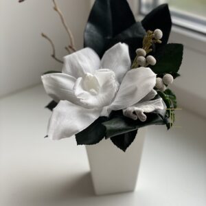 Стабилизированная орхидея является отличным украшением стойки ресепшн или прикроватной тумбы. Нежный распустившийся бутон цветка словно не подвластен времени. Он стоит в горшочке, окруженный листьями. Белое квадратное капо прекрасно дополняет и обрамляет композицию.