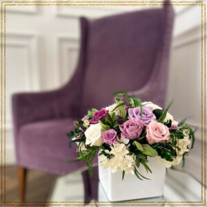 Современный букет из стабилизированных цветов в бежево-сиреневой гамме. Кубическая ваза белого цвета оттеняет магический цвет композиции. Великолепные бутоны роз и гортензии сочетаются с зелеными веточками и узкими удлиненными листиками.