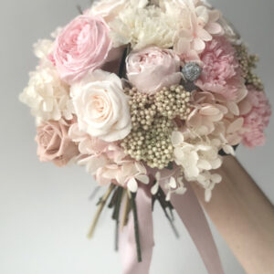 Великолепный нежно-розовый свадебный букет из стабилизированных цветов идеальное решение для свадебного марафона. Кремовые розы, пионы, бусины и ленты создают воздушную легкость и гармоничную композицию, которая сохранит свежесть даже в конце веселой свадебной вечеринки. Невеста точно не захочет расставаться с такой красотой!